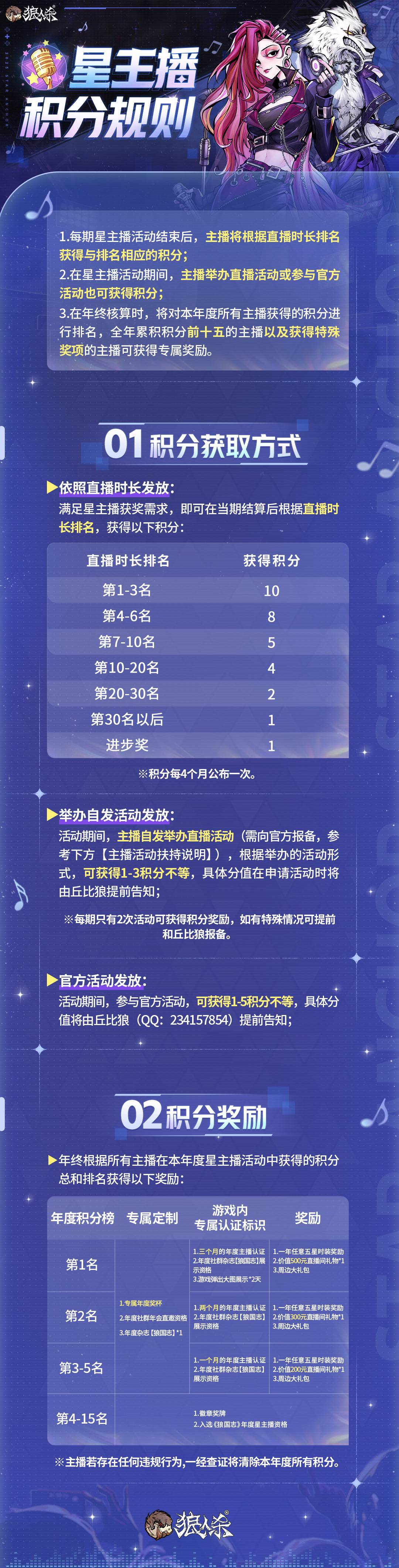 活动期间,主播自发举办直播活动(需向官方报备,参考下方【主播活动扶持说明】),根据举办的活动形式,可获得1-3积分不等,具体分值在申请活动时将由丘比狼(QQ:234157854)提前告知;