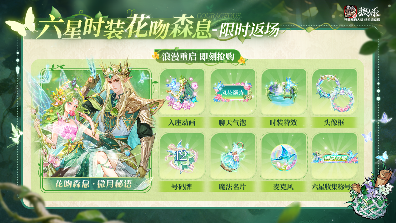 花吻森息系列六星时装限时返场,还有配套装扮等你来解锁,一起感受魔法与精灵的春日故事。