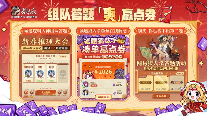 诚邀各路逻辑大神组队参与新春答题挑战,与队友默契配合,参与新春推理大会即可赢取海量点券,还有趣味猜数字环节等你来挑战,累计答题积分更能解锁专属彩蛋称号。